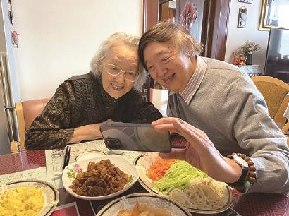 冯骥才陪妈妈吃寿面,自拍留影