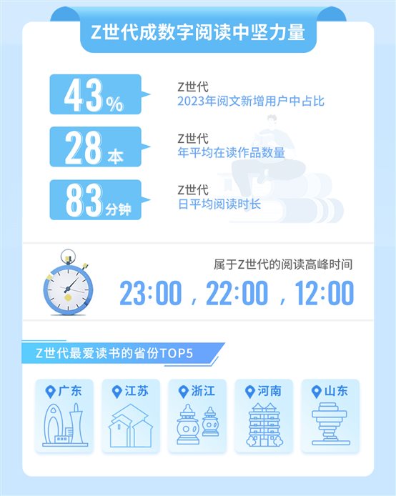 作为互联网原住民,Z世代是数字阅读的生力军。阅文集团数据显示,Z世代用户全年在读作品数达到28部,平均每天阅读时长达83分钟。其中,晚上11点、晚上10点和中午12点是阅读高峰期。从地域上看,广东、江苏、浙江、河南、山东位列Z世代最爱读书省份前五位。