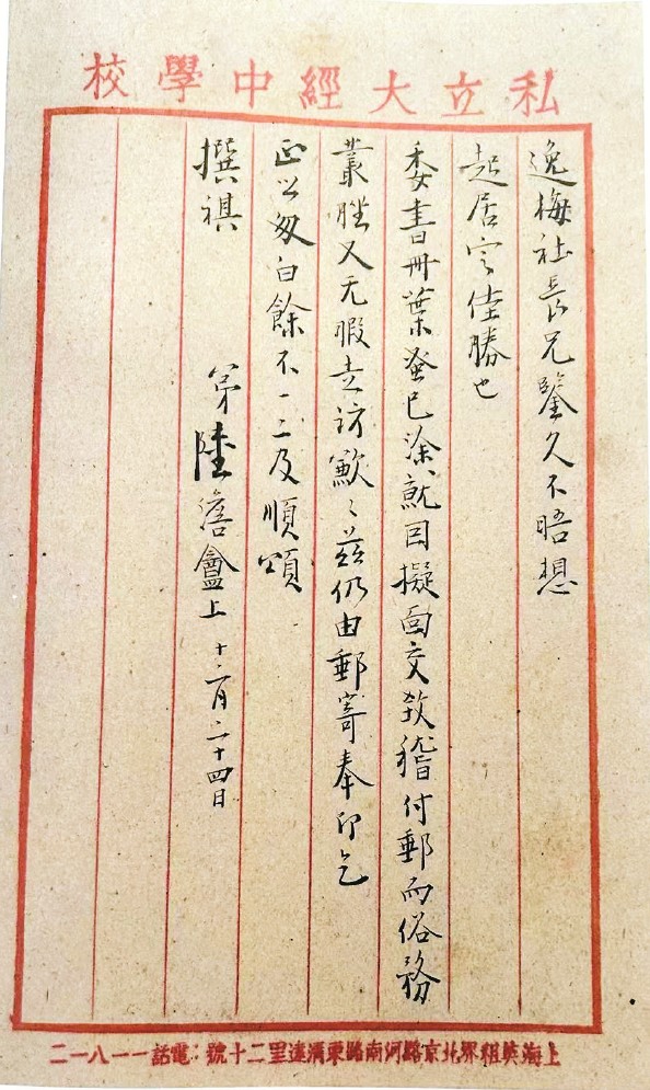 岁月不居,春秋代序。想起要爬梳这段往事,是因为翻检今年为纪念郑逸梅诞辰130周年而出版的《郑逸梅友朋尺牍 郑逸梅家藏尺牍》一书,看到一封陆澹安写给郑逸梅的信,信笺纸抬头为“私立大经中学校”,落脚处则印有“上海英租界北京路河南路东清远里二十号:电话一一八一二”字样。