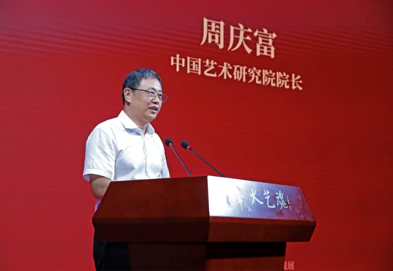 中国艺术研究院院长周庆富在致辞中表示,本次展览既是对历史的铭记、对先烈的缅怀,更是对伟大抗战精神的传承与弘扬。中国艺术研究院作为我国唯一的国家级综合性学术机构,自创建伊始便汇聚了王曼硕、马彦祥、王朝闻、张庚、葛一虹、朱丹、苏一平、江有生、贺敬之、马可等一大批具有延安鲁艺背景的艺术家和学者。同时,中国艺术研究院在传承延安鲁艺精神的基础上,持续积累并整理了一批极具历史价值的红色艺术文献与作品,它们不仅记录了历史的烽火岁月,更生动地展现了艺术家们以文艺为武器的战斗精神、以爱国主义为核心的民族精神和全心全意为人民服务的奋斗精神。