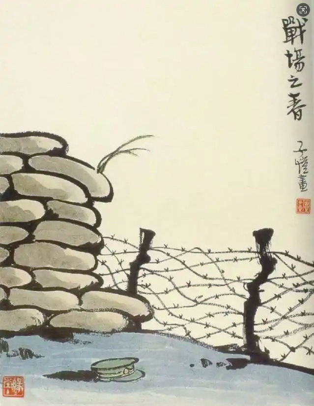 丰子恺坚信抗战必胜,其漫画作品灌注必胜的信念,充满鼓舞人心的力量。他曾说:“古语云:‘众志成城’,我们四百兆人团结所成的城,是任何种炮火所不得攻破的!”他的漫画作品尺幅小,题材微,却具有强烈的艺术感染力。比如《生机》和《战场之春》,主角均为一株小草,纤细柔弱,一棵从灰暗的断壁中探出头来,一棵在冰冷的铁丝网边昂首向天,寥寥数笔,生机立现。《战场之春》中题诗曰:“谁言争战地,春色渺难寻。小草生沙袋,慈祥天地心。”残酷的战场上,小草顽强生长,印证着天地的慈祥之心,好生之德。