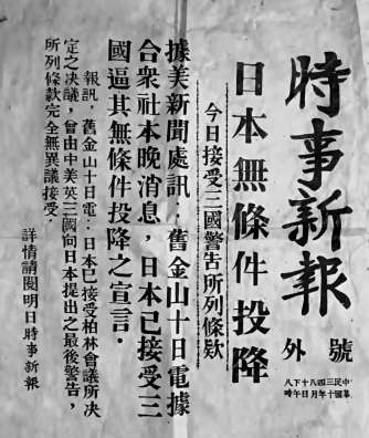 事实上,早在1945年8月10日,日本政府即已分别电请中立国瑞典、瑞士,将其投降之意愿转达中、美、英、苏四国,“日本政府决定无条件投降”的消息遂通过无线电波传遍世界。当时,身处中国西南一隅的陈寅恪,究竟通过何种渠道获知此讯,至今尚未见有确切的考证予以说明。不过,仅据笔者所知所见,抗战期间将总部从上海迁至重庆的《时事新报》,确曾于1945年8月10日这一天下午印发过一份“号外”,日本无条件投降的消息,就赫然印于这份“号外”之上。当晚成渝两地民众可凭此“号外”,较早获悉这一消息,确为事实。