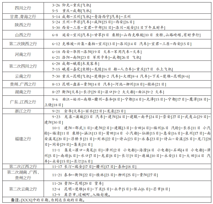 在漫天烽火中旅行,绝非易事。多年的兵戈扰攘,使得中国的交通线路多有阻断,且陈嘉庚所到之处以高原、山地和丘陵等地形为主,山高坡陡,地形复杂,更加重了出行的困难程度。面对这些复杂情况,陈嘉庚也曾心怀忐忑,并对自己能顺利完成跨越数省的旅途颇感欣慰。“他开始说当他离渝由成都启程时,颇担心自己不惯作长途旅行,可是这次居然能依期完成旅程,毫不感觉疲惫,这是非常愉快兴奋的事。”(《华侨领袖陈嘉庚救国言论集》)然而,说是顺利,乃依结果而论,若论过程,其实颇为曲折。一方面是交通不便,陈嘉庚以各色交通工具接力的方式才得以踏遍祖国这些河山。据统计,除步行外,陈嘉庚乘坐的交通工具有十余种,火车、飞机、水上飞机、军用飞机、汽车、货车、军用卡车、木炭客车、大火船、汽轮、小汽船、小电船、人力车、轿子等,可谓无所不包。另一方面是需要应对旅途中时常发生的意外情况。例如,“坐轿,山路崎岖,有时步行”;有时车坏,需临时停留,“乘汽车离贵阳,中途车坏,晚住河池”;有时赶时间,常于凌晨、午夜出发或到达目的地,“午夜乘火车离开西安”“凌晨五点抵桂林”“午夜到上饶”“从贵阳,乘西南运输公司货车,于29日半夜到昆明”。此外,恶劣的天气也形成了严苛的挑战。6月18日,自西安乘火车抵华阴途中,“当时正值盛夏,车厢内气温高达摄氏四十度”。(《陈嘉庚年谱》)