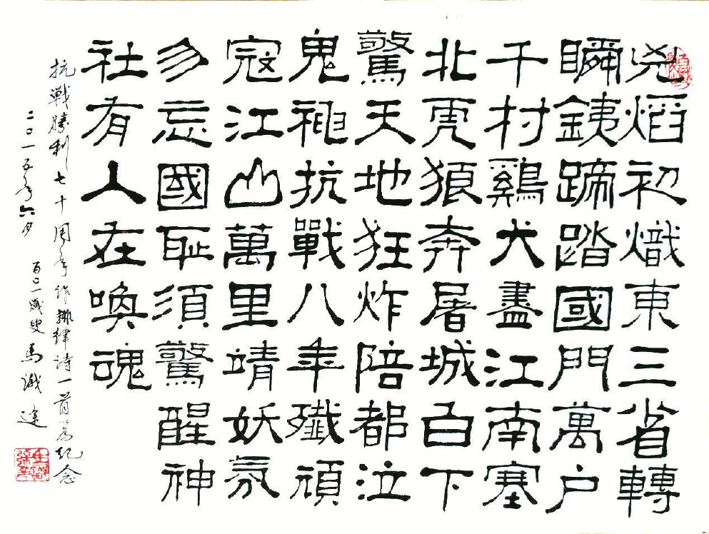2024年8月,中国现代文学馆曾主办“浩然正气——马识途书法展”。在展览中,中国现代文学馆特意从字画库珍选了马老极具代表性的书法作品,其中就有他在抗战胜利70周年时所书的诗句,这幅书法是时年100周岁的马老写于2015年6月。凶焰初炽东三省,转瞬铁蹄踏国门。万户千村鸡犬尽,江南塞北虎狼奔。屠城白下惊天地,狂炸陪都泣鬼神。抗战八年歼顽寇,江山万里靖妖氛。勿忘国耻须惊醒,神社有人在唤魂。