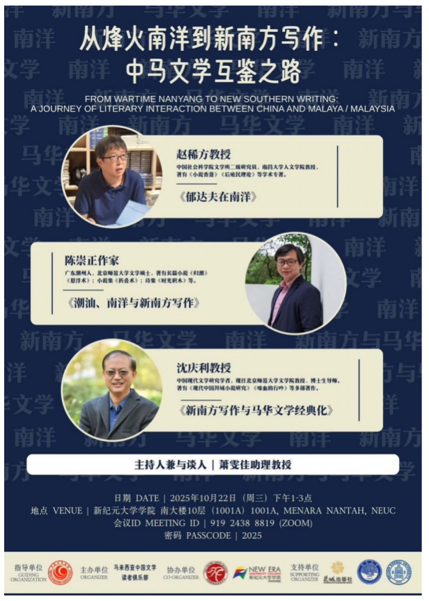 在新纪元大学学院的“从烽火南洋到新南方写作:中马文学互鉴之路”座谈会由该学院校长莫顺宗主持,马来西亚中国文学读者俱乐部负责人拿督吴恒灿,陈崇正、赵稀方和沈庆利先后发言,座谈会以线上线下形式同步进行。