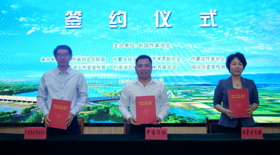 中国作协创联部主任彭学明,内蒙古文联党组成员、副主席闫艳,巴彦淖尔市委常委、临河区委书记赵峻岭签署新时代文学实践点三方合作协议。