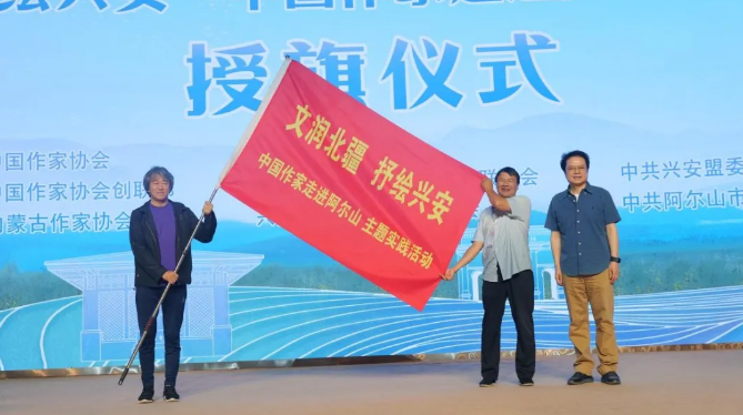 授牌仪式上,内蒙古文联党组成员、副主席闫艳向阿尔山市委常委、宣传部部长邰海峰颁授内蒙古作家“深入生活、扎根人民”新时代文学实践点牌匾;第十四届全国政协常委、中国作协副主席、中国戏剧家协会副主席陈彦向兴安盟行署副盟长、科右前旗委书记孙书涛颁授中国作家“深入生活、扎根人民”新时代文学实践点牌匾,陈彦并向参加主题实践活动的作家代表全勇先、王计兵授旗。