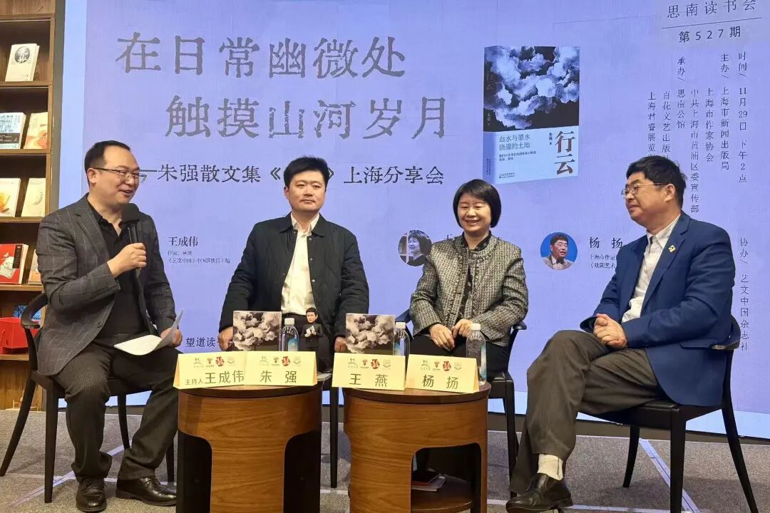 2025年11月29日下午,作家朱强携散文集《行云》做客思南读书会第527期,与上海市作家协会副主席、《戏剧艺术》主编杨扬,《散文海外版》执行主编王燕,共同探讨散文创作中地域文化书写与日常经验的文学转化。浦东新区文化艺术指导中心党总支副书记毕震钧、浦东新区老港镇人大副主席顾方强,作家安谅、包光寒、崖丽娟、龚文瑞、姬中宪、潘都、张宏羽、王树才、王冬等嘉宾出席活动。活动由《艺文中国》中国区执行主编王成伟主持。